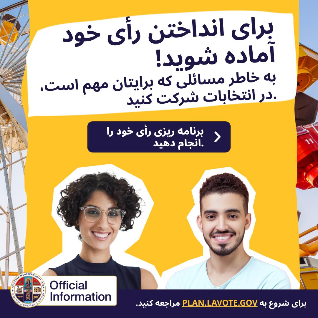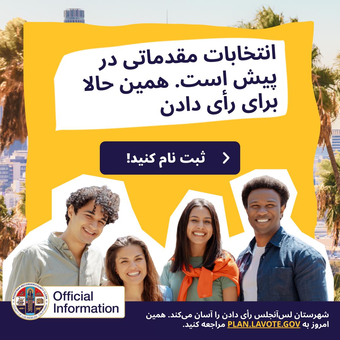 آیا میدانستید که ثبت نام برای رأی دادن فقط ۵ دقیقه طول میکشد؟ جداً! این فرآیند سریع و آسان است و میتوانید آن را از طریق رایانه یا تلفن خود انجام دهید. برای ثبت نام امروز به PLAN.LAVOTE.GOV مراجعه کنید!