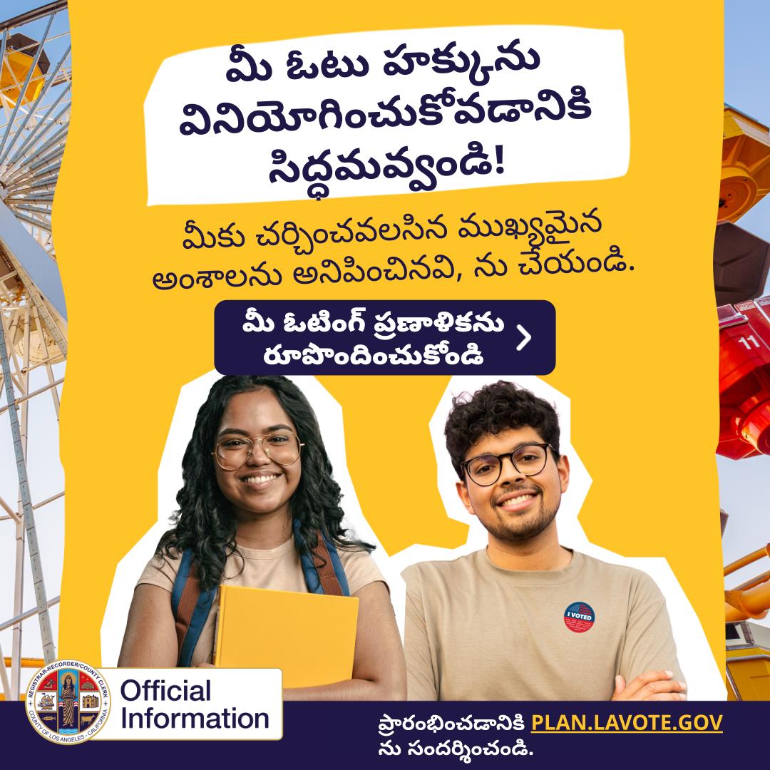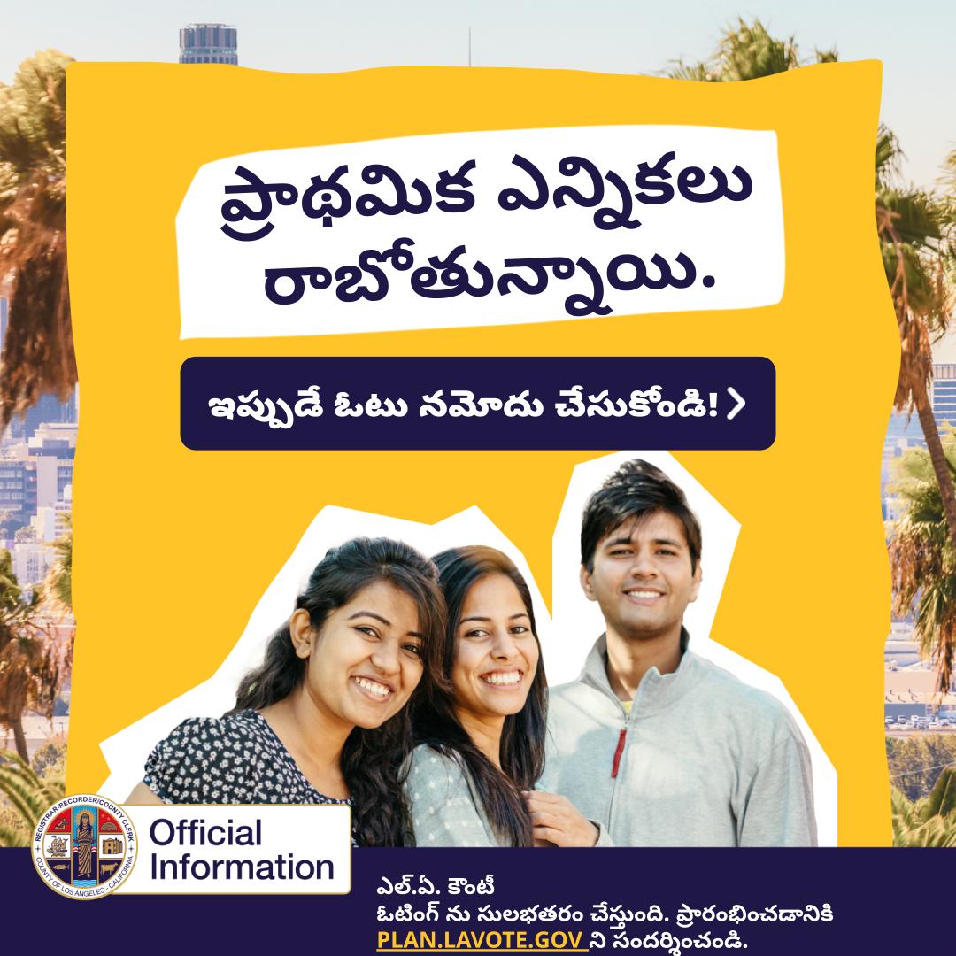 2026 రాష్ట్ర వ్యాప్తంగా ప్రైమరీ ఎన్నికలు జరుగుతున్నాయి. మీరు మీ ఓటు వేయడానికి సిద్ధంగా ఉన్నారా? ఓటు నమోదు చేసుకోవడానికి, మీ ఒక నమోదును సరిచూసుకోవడానికి/నవీకరించుకోవడానికి, ఎన్నికల సమాచారాన్ని తెలుసుకోవడానికి, మరియు మీ ప్రణాళికను రూపొందించుకోవడానికి ఈ రోజే PLAN.LAVOTE.GOV ను సందర్శించండి.